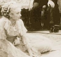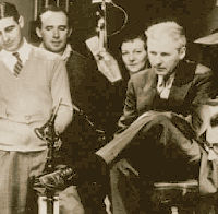Becky Sharp went before the Technicolor cameras in December of 1934. The untimely death of its original director, Lowell Sherman, a month later, caused the picture to be restarted when Rouben Mamoulian took over the megaphone. Using Kodak panchromatic film which had an equivalent rating of approximately ASA 5 after the light passed through filters and beam splitters, photography required terrific amounts of light. Seen above is the beautiful Miriam Hopkins on the floor, Director of Photography, Ray Rennahan (a Technicolor icon) sitting on the stool with legs crossed, and Director Mamoulian, appearing to be incubating his eggs while sitting on a light in front of the camera. And, yes, that's a camera in its sound blimp, not a refrigerator. With the intense light levels required, most likely the crew would have appreciated a nearby refrigerator. Considering the clothing being worn, the stage must have been kept a bit frigid. Becky Sharp is discussed a bit more, later in this section.