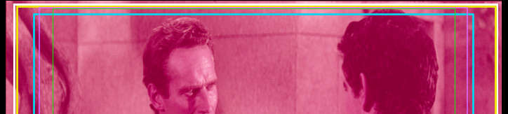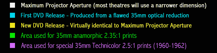 Illustrated above is a picture taken directly from a faded MGM Camera 65 print. The white boundary indicates the maximum specified projector aperture dimension. The cyan boundary shows the first DVD release and it's easy to see that there was excessive cropping. The yellow boundary is the new DVD release and it is almost exactly the same as the projector aperture dimension. This, in the opinion of the Curator, is a major improvement in the image. Other boundaries show normal 35mm extraction areas for 2.35:1 prints and for the special "letterboxed" 2.5:1 a/r 35mm anamorphic prints produced by Technicolor in 1960-1962. The projected images from all these formats would be stretched horizontally by a factor of 1.25:1. During the film's 1969 roadshow reissue, flat (non-anamorphic) 70mm prints were made with a 2.5:1 aspect ratio similar to the Technicolor 35mm prints. The Curator would prefer that this new DVD would have been made with the same 2.5:1 aspect ratio. The reason for this is that the extreme width of the picture results in loss of vertical detail in the anamorphic DVD. The information lost at the sides was deemed acceptable to MGM back in the film's initial release and subsequent 1969 roadshow run. The decision to use the full projector aperture width versus the 2.5:1 width of later prints is understandable. Warner Home Video would have been inundated with complaints otherwise.