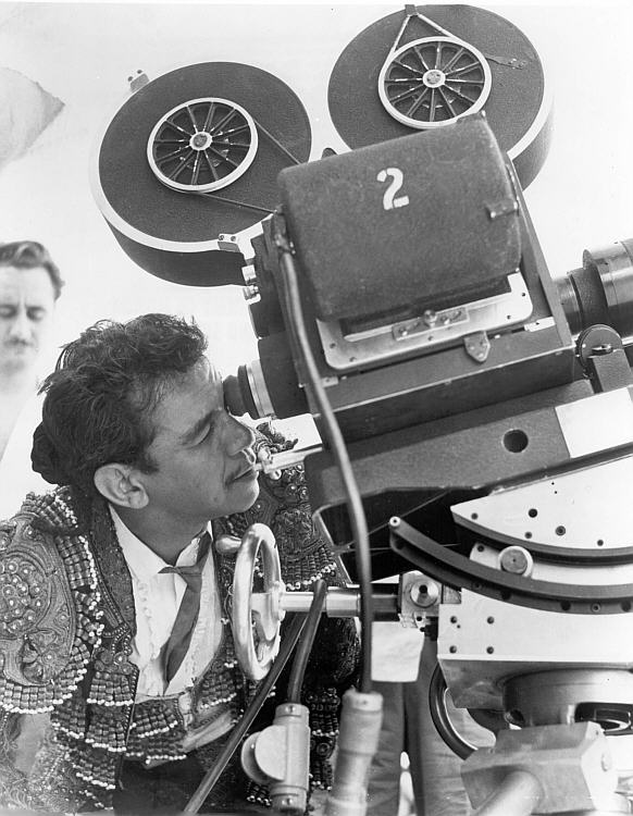 Cantinflas peers through the bugeye lens during the filming of the bullfight sequence of Around the World in 80 Days Back To Gallery Menu