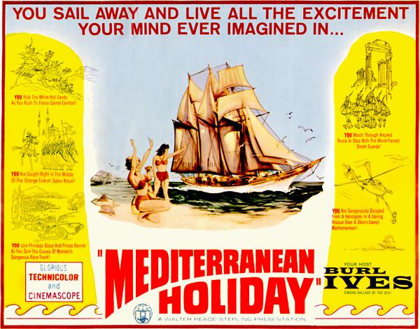 Described by some as a "low-rent version of Windjammer", the Walter Reade-Sterling organization's release of Mediterranean Holiday had to be one of the most eclectic ever made. No fewer than five different "versions" were shown during the exceedingly brief run of this travelogue. The film was shot in MCS-70, a good quality Todd-AO clone. The producers coined the CINEVISION name for presentation on a deeply curved screen. For flat screen presentation the system was pretty much ignored and "70MM" was to be advertised. Most people saw the picture in 35mm anamorphic reduction prints advertised as CinemaScope. In cities with Cinerama houses that were desparate for something to run, a deal was worked out with Cinerama, Inc. to advertise the film as being a genuine Cinerama release.