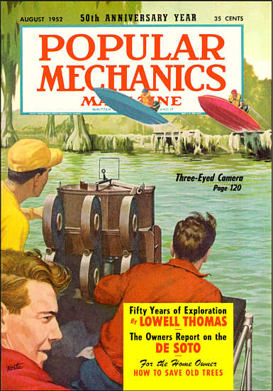 | A lot happened in Oyster Bay, New York between the time that Popular Science printed their article on "Super Movies" in August, 1950 and the publication of this article in Popular Mechanics in August of 1952. This Is Cinerama was being readied for its premiere in just three months. Artwork, created by the Popular Mechanics staff would reappear in modified form for each of the Cinerama productions. Interestingly, the issue also contained a completely unrelated artice on exploration by Lowell Thomas. No mention of Thomas appears in the Cinerama article and no mention of Cinerama appears in the exploration article. We'd have to wait for Seven Wonders of the World and Search For Paradise to see Thomas in the locations featured in his article. And, by the way, the owners loved their new DeSoto, but like Cinerama, interest seemed to wane by the early 1960s. |