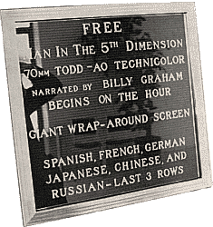A World's Fair Pavilion with a 70mm Todd-AO film is a costly investment. Advertising materials may not have been too eye catching as seen above. Sales of souvenir books (right) helped cover costs.