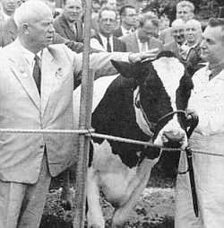 Seen at right foreground, Nikita Khrushchev, judge of bovine beauty, tractors, ICBMs, and decadent Capitalist motion pictures. He's the one wearing a tie.
