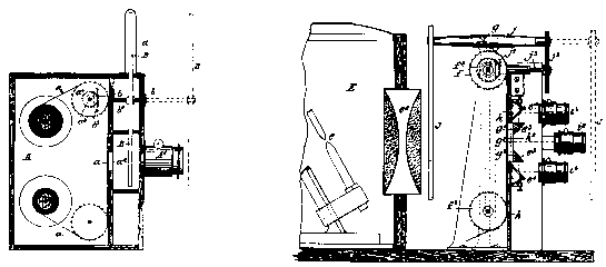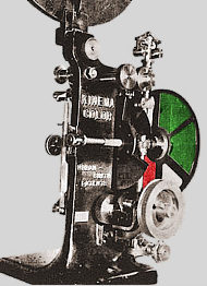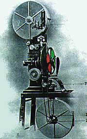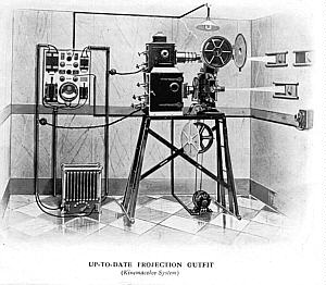 Seen above left is a Kinemacolor camera with the rotating red/green color filter. (The front plate and lens are removed to make the filter wheel visible). Above right is the Kinemacolor projector. Below left is a closeup of the projector, which, like the above illustration, does not include the lamphouse. Below right is an "Up-To-Date Projection Outfit" (Circa 1915). The outfit appears to include a slide projector in addition to power supplies for lamphouses. Note that the projector is seen from the opposite side of the other two images.