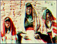 Kinemacolor was one of Technicolor's primary rivals in the period prior to 1920. The frame below is from the successful British documentary color film The Delhi Durbar (1912) which recorded the Indian celebrations of the coronation of King George V. (And don't you just know that all those folks in India were really, really, happy to have a new British monarch. The three people in the film look more like Arizona Indians than Delhi Indians. In fairness to the monarchy, the Durbar celebrated the first time a British monarch had visited the crown jewel of the Empire.)