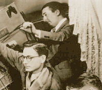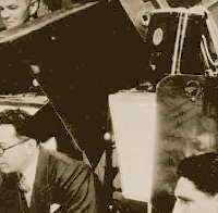 Becky Sharp went before the Technicolor cameras in December of 1934. The untimely death of its original director, Lowell Sherman, a month later, caused the picture to be restarted when Rouben Mamoulian took over the megaphone. Using Kodak panchromatic film which had an equivalent rating of approximately ASA 5 after the light passed through filters and beam splitters, photography required terrific amounts of light. Seen above is the beautiful Miriam Hopkins on the floor, Director of Photography, Ray Rennahan (a Technicolor icon) sitting on the stool with legs crossed, and Director Mamoulian, appearing to be incubating his eggs while sitting on a light in front of the camera. And, yes, that's a camera in its sound blimp, not a refrigerator. With the intense light levels required, most likely the crew would have appreciated a nearby refrigerator. Considering the clothing being worn, the stage must have been kept a bit frigid. Becky Sharp is discussed a bit more, later in this section.