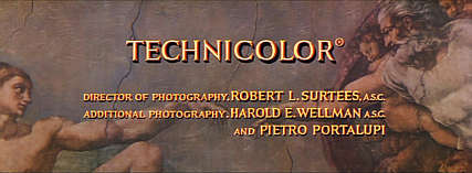 It is a sad fact of life that few people assembling video transfers recognize that audiences are capable of figuring out that overtures are played without a picture. This has confused theatre operators that run prints of classic roadshow films and they think that the curtains are supposed to be open for the pre-picture music. While it's nice that the new DVD has at least attempted to match the lettering used by Pacific Title, roadshow films should have nothing on the screen during the overture. The only company that has done this is 20th Century Fox Home Video, and they're not consistent. The worst part of this intrusion on the music is that it shows the audience a title graphic that they will see later on, and that artwork is electrifying when it appears. If the folks at Warner Home Video and virtually all the other companies insist on putting something on screen, how about small gray letters in the corner of a black screen, as illustrated below? Serving Suggestion