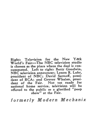 owner of the principal television patents in this country and the company that has done the most here to develop television to date. The newspapers jumped in with both feet when Mr. Sarnoff announced that limited program service would be started from the RCA experimental station in the Empire State Building in April, and the RCA would manufacture television receivers for sale in the New York area.