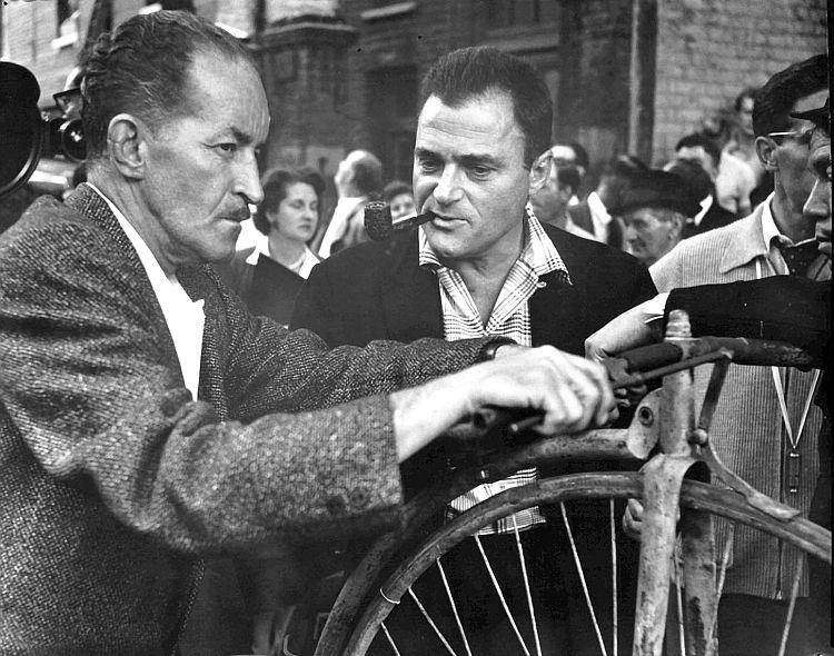 At left is director of photography, Lionel Lindon, ASC listening carefully to the preachings of producer Mike Todd during the shooting of the opening scenes in London. At far right, barely visible is Cantinflas, and at far left, just as barely visible, is the "bugeye" lens on the camera that photographed Passepartout on his antique bicycle.Back To Gallery Menu