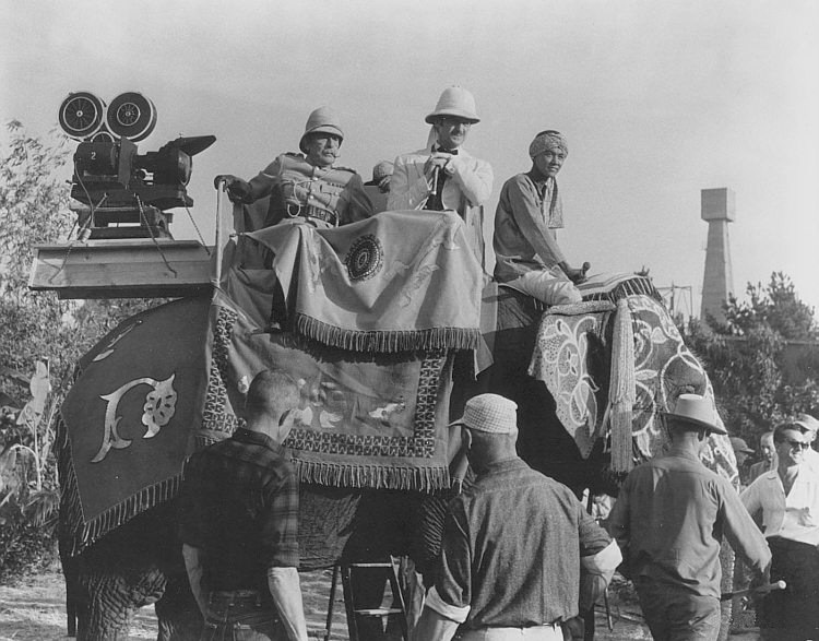 The venerable camera 2, first of the production cameras assembled for Todd-AO. The second was camera 1, and don't ask me how the numbering came about. David Niven and Sir Cedric Hardwick are perched atop an elephant during the India segment of Around the World in 80 Days. The bugeye lens is now in the WideScreen Museum's cinema optics collection, the camera was long ago cannibalized for large format special effects work.