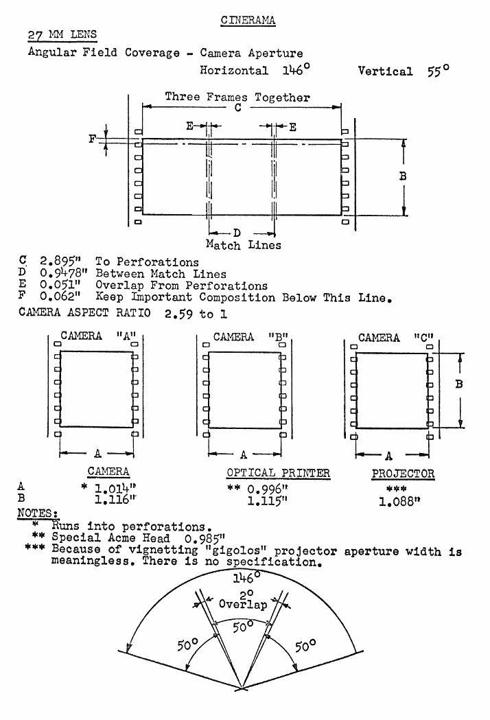 This handmade sheet was unearthed in the Cinerama archives by producer-director David Strohmaier during his research for the production Cinerama Adventure (See our links page to visit the Cinerama Adventure website). The sketch has been reproduced in a number of publications such as American Cinematographer and The American Cinematographer Manual. It's as good a source for bar bets as you're apt to find.