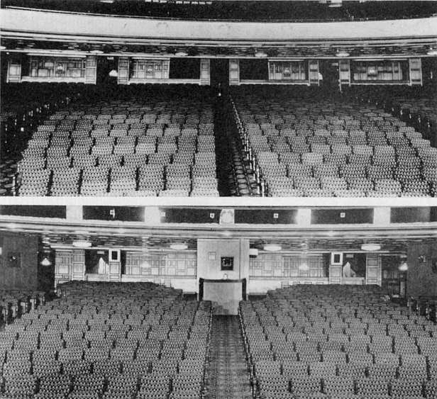 Here is what happens to the main floor of an auditorium in a theatre equipped with the three-booth system of Cinerama. The upper photo shows the auditorium as it appeared before the remodeling took place and, as Detroiters knew it for many decades. The lower pictures shows the three booths at the rear and the control panel area directly in front of the center booth. Approximately 50 seats were eliminated to provide the center booth alone.