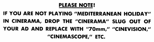 Described by some as a "low-rent version of Windjammer", the Walter Reade-Sterling organization's release of Mediterranean Holiday had to be one of the most eclectic ever made. No fewer than five different "versions" were shown during the exceedingly brief run of this travelogue. The film was shot in MCS-70, a good quality Todd-AO clone. The producers coined the CINEVISION name for presentation on a deeply curved screen. For flat screen presentation the system was pretty much ignored and "70MM" was to be advertised. Most people saw the picture in 35mm anamorphic reduction prints advertised as CinemaScope. In cities with Cinerama houses that were desparate for something to run, a deal was worked out with Cinerama, Inc. to advertise the film as being a genuine Cinerama release.