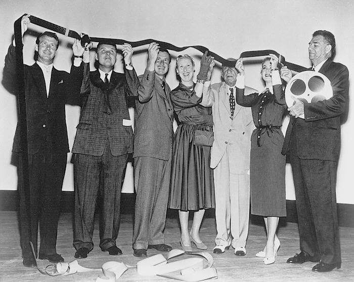 Publicity shot of Oscar Hammerstein reeling off Todd-AO film for Shirley Jones, Gene Nelson, Charlotte Greenwood and some folks who's names don't come to mind. HOLD THAT FILM BY IT'S EDGES, DAMMIT!Back To Gallery Menu