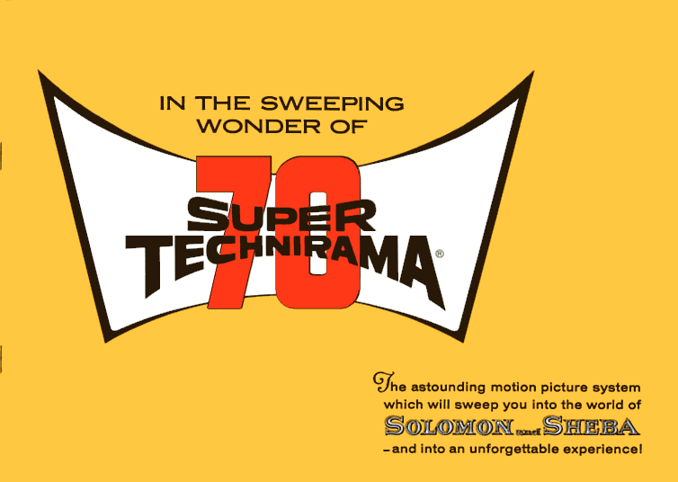 SUPER TECHNIRAMA 70 - Technicolor's large format version of Todd-AO was introduced with substantial ballyhoo to the press and public with the release of the incredibly unremarkable Solomon and Sheba in October, 1959. This booklet was made available wherever the film ran in a roadshow engagement. While Technirama and its 70mm blowup version were exceptionally good systems, the reader might detect a bit of the typical expedient exaggeration one came to expect when the latest wide screen system was introduced. Exaggerated or not, it's a fun piece of nostalgia.