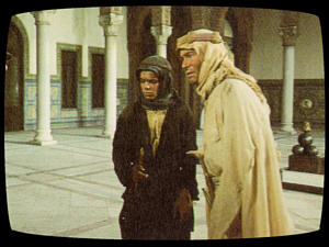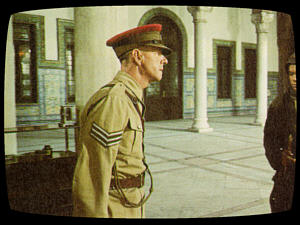 Pan & Scan is the long standing solution to the problem of presenting wide screen films on the narrow screen television. The reader can easily see the problems in this particular example. In the left frame, the sergeant is saying, "Mr. Lawrence, is it?". Well, how would we know? If you have a short attention span then you might not remember who it is that has been excluded from the image. A moment later we learn, in the right frame, that it is indeed Mr. Lawrence, but we might have forgotten who asked the question in the first place. Making matters worse, those pesky windows appear in the background of both sections, making it still more difficult to appreciate the continuity of the film. | ||