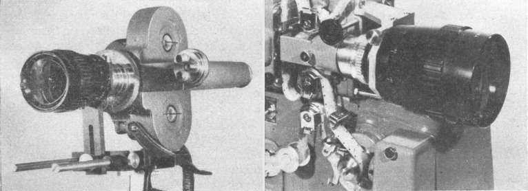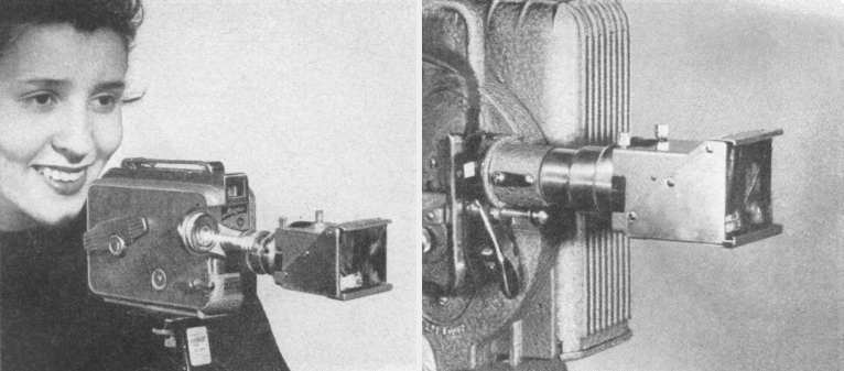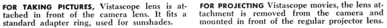 | How Vistascope works VISTASCOPE uses the curved reflecting surfaces of prisms to put on the squeeze that fits wide-picture scenes on narrow 16-mm. or 8-mm. movie film. Its light-bouncing sys-tem is shown in optical diagram at right. When the same lens is put on a projector, the distorted image is unsqueezed and projected as a widescreen picture. | ![]() | |