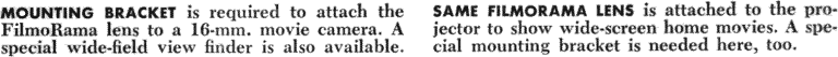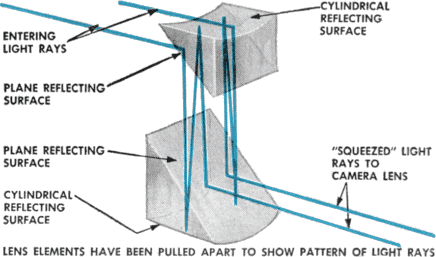 | This is the FilmoRama way FILMORAMA achieves its 16-mm. wide-picture-taking squeeze and wide-screen-projection unsqueeze by refraction, as shown in the optical diagram at right. Instead of being reflected, the light rays are compressed for taking, or magnified for projection, as they pass through cylindrical lens elements of the anamorphic attachment. | ![]() | |
