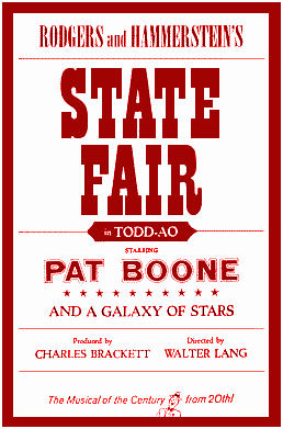 Trade paper ad for Rodgers & Hammerstein's 1962 remake of State Fair which was about to enter into production. About all that is accurate in the ad is Pat Boone's presence. Early on the project looked like a turkey. José Ferrer took over the directorial duties and Todd-AO, which was still partly owned by R&H, was replaced with CinemaScope. Ann Margret sang songs originally written for Dick Haymes in the 1945 Technicolor production. It was an awful mess and audiences stayed away in droves.